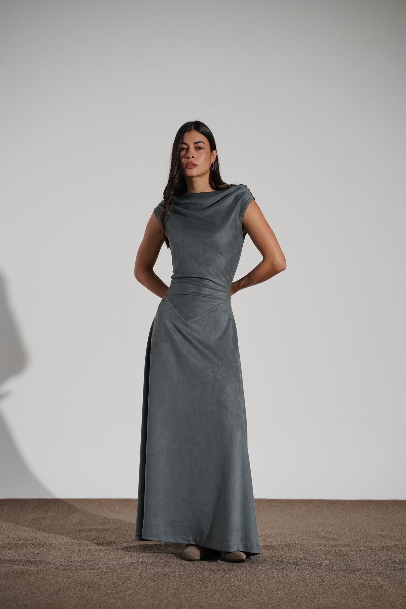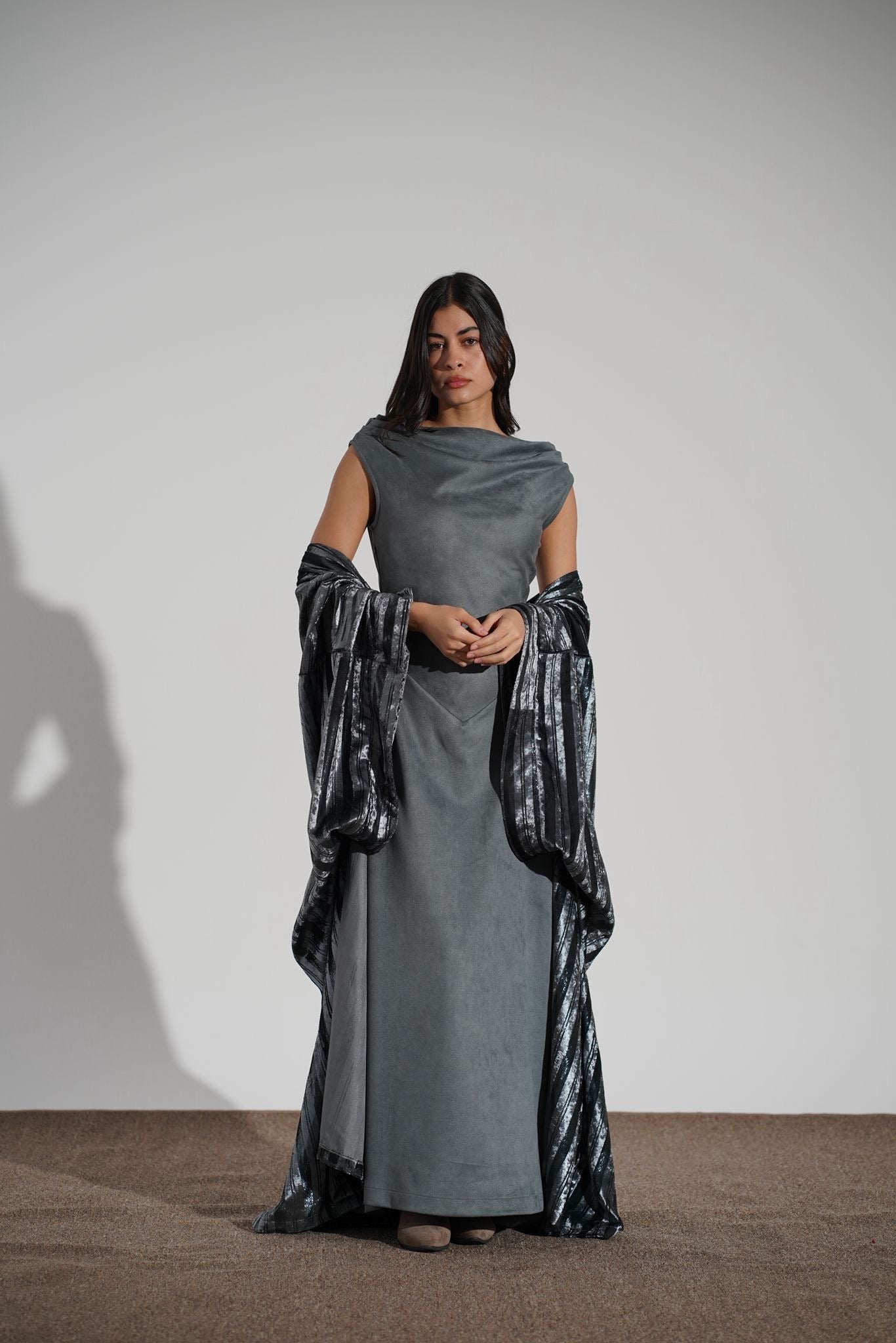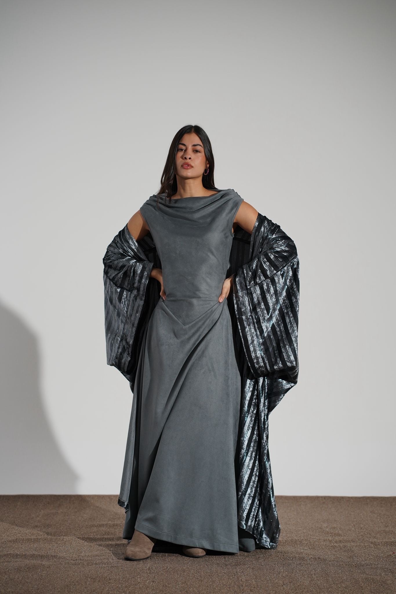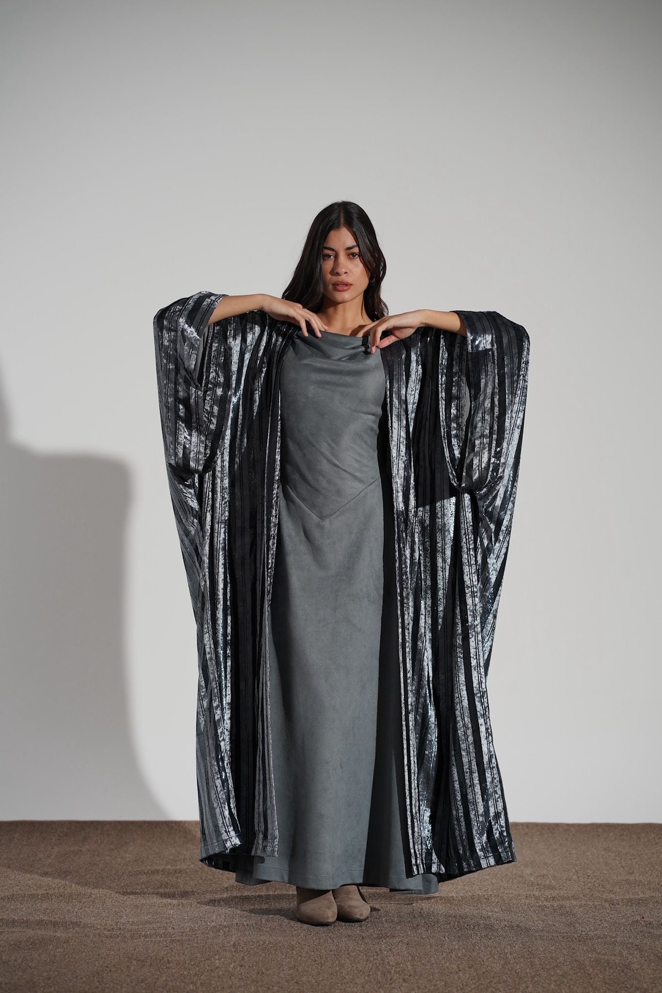 A two piece set that elevates your look with an inner sleeveless dress and shimmery chic light metallic velvet Bisht